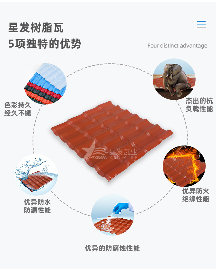 合成樹(shù)脂瓦色彩持久、造型美觀、具有中國(guó)建筑特色。采用超高耐候性工程樹(shù)脂ASA精制而成,擁有質(zhì)輕、防水防火、保溫隔熱、抗腐蝕、堅(jiān)韌耐用,安裝快捷等特點(diǎn),簡(jiǎn)直是屋面裝飾的最優(yōu)選擇!使用壽命長(zhǎng)達(dá)30年!