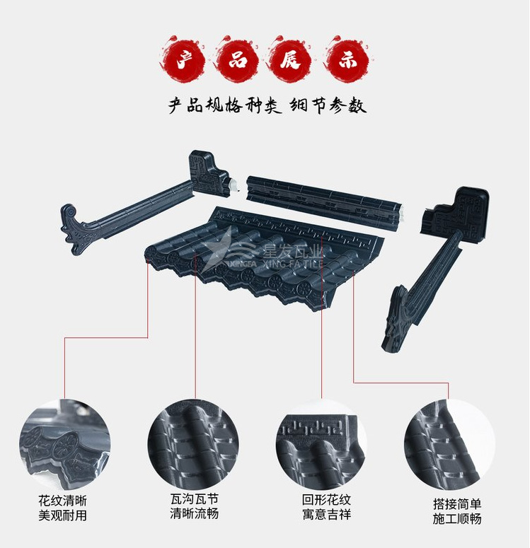 一體仿古瓦又叫仿古瓦,復古瓦,又名一體仿古屋檐樹脂瓦。外觀極具古典美感、經(jīng)久耐用,適用于自建房、別墅。