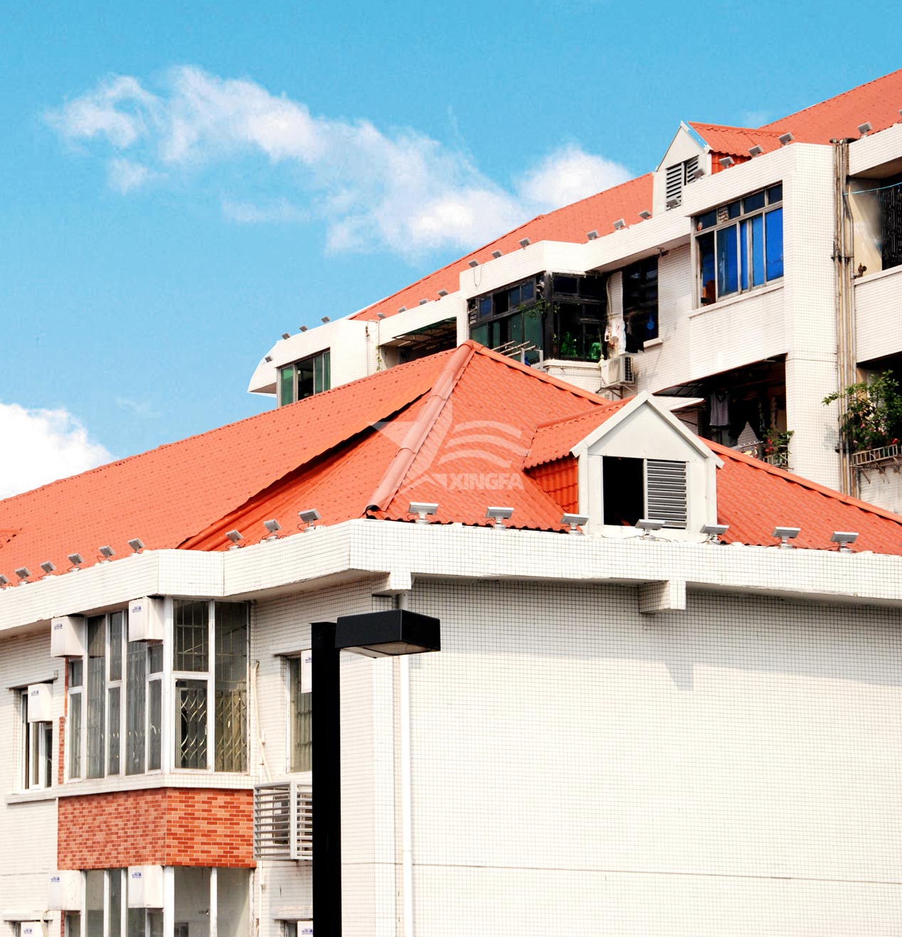 在這些問題區(qū)域,雨水會侵入屋頂并進(jìn)入室內(nèi),造成漏水和滲水現(xiàn)象,對修補(bǔ)和維護(hù)工作帶來不小的煩惱。然而,傳統(tǒng)的金屬板和水泥砂漿修補(bǔ)方法卻并不能百分之百地保障屋頂不再滲漏!合成樹脂瓦采用高分子材料制成,具有致密的結(jié)構(gòu)且不吸水,有效阻止了滲透現(xiàn)象的發(fā)生,從材料本身保障了自身防水功能。即便不添加額外防水層,它也能表現(xiàn)出卓越的防水效果,無需使用繁瑣的水泥砂漿,安裝過程便捷,只需使用自攻螺絲進(jìn)行固定即可。此外,它還可以根據(jù)屋頂形狀進(jìn)行靈活裁切,搭配專業(yè)防水配件進(jìn)行安裝,為各種節(jié)點(diǎn)漏水問題提供了優(yōu)質(zhì)解決方案。