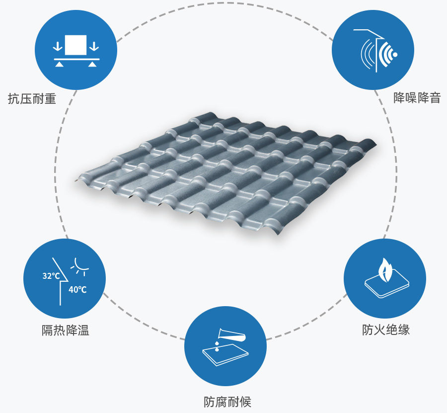 星發(fā)樹脂瓦5項獨(dú)特的優(yōu)勢 抗壓耐重 I 降噪降音 I 防火絕緣 I 隔熱降溫 I 防腐耐候
